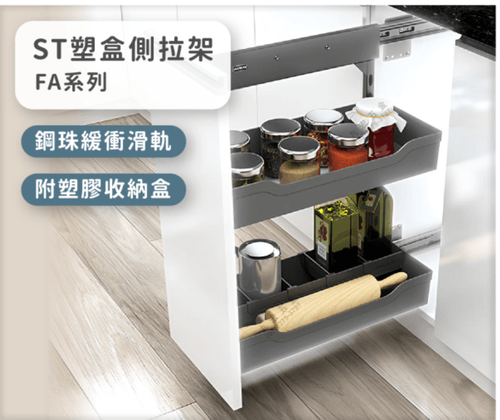 這款側拉架專為底櫃設計,附有可拆式ABS塑膠收納盒,